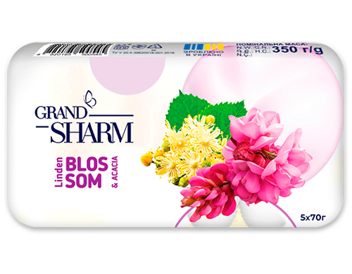 Мило ТМ Grand Шарм “Липовий колір та акація” – класичне туалетне мило на основі натуральної сировини. Має аромат липи та акації. Упаковка має приємний та естетичний дизайн. Добре милиться у воді будь-якої жорсткості. Повністю змивається водою.